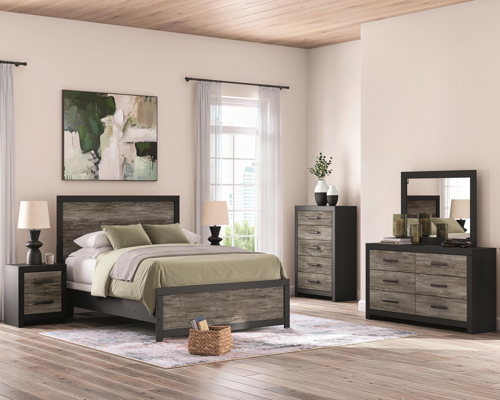 The panel bed rails require a box spring. The mirror offers flexible placement and can be mounted on the dresser or hung on the wall, either vertically or horizontally.